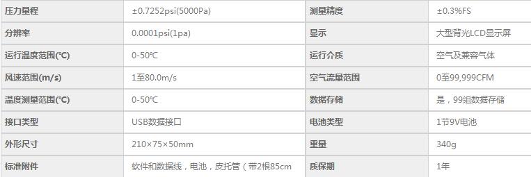 ·在難以觸及或者密封的地方,可以用皮托管風速計測量風速/風量,而葉片風速計不適合 ·具有最大值/最小值/平均值、相對值、時間戳、數(shù)據(jù)保持和自動關(guān)機功能 ·配有大型背光LCD顯示屏 ·具有歸零功能,可實現(xiàn)偏移糾正或測量 ·可在各種模式下保存/調(diào)用多達99個讀數(shù) ·配有USB端口,包含軟件 ·5種壓力單位顯示:psi/mBar/mmH2O/inH2O/Pa ·同時顯示壓力,空氣流速或流量及溫度 ·數(shù)據(jù)保持和自動關(guān)機功能 ·零偏移校正或測量功能 ·壓力范圍:±0.7252psi ·壓力測量精度;±0.3% ·最大壓力:10psi ·風速測量范圍:1~80m/s ·風速測量精度:±1%FS ·空氣流量測量范圍:0~99999CFM±3% ·溫度測量范圍:0~50℃ ·外形尺寸:210×75×50mm ·重量:340g