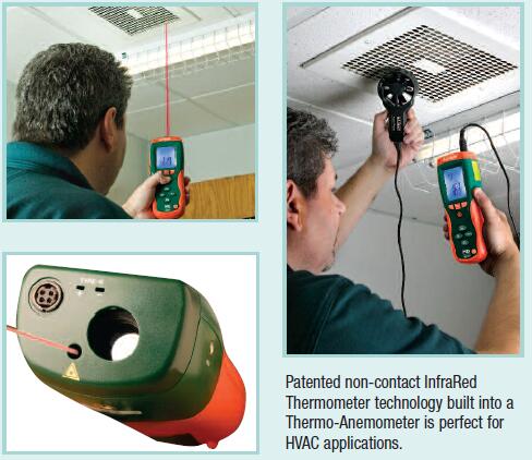 具有內置紅外非接觸式測溫功能,D:S比可達30:1,可測量高達500℃的遠程表面溫度 同時顯示空氣流量、空氣流速和周邊溫度 有8個內存位置,用戶可存儲多個風管面積值,方便以后快速調用 保存氣流量或風速的20個平均讀數 大尺寸的背光LCD顯示屏 風速傳感器葉輪直徑72mm,線長120cm 數據保持和最大值/最小值/平均值 自動關機