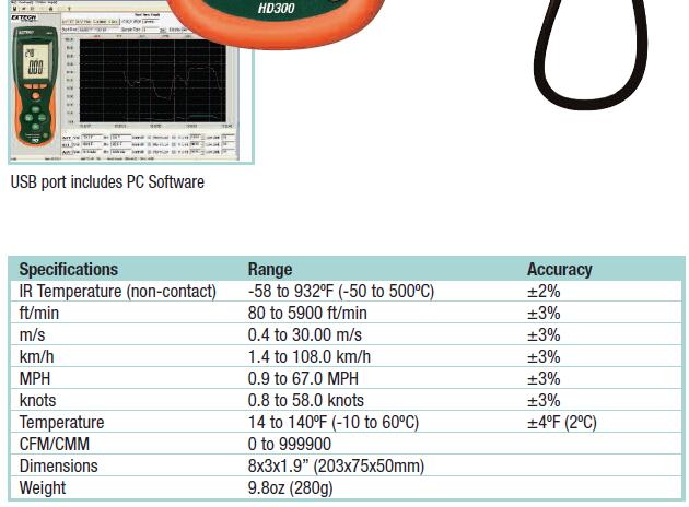美國Extech HD300葉輪風速儀風速測量范圍:0.4~30m/s,可測量并顯示風速,氣流量,氣溫和表面溫度(采用內置非接觸式紅外線溫度計)?蓽y量高達500℃的遠程表面溫度。