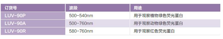 LUV-90P 用于觀察植物綠色熒光蛋白LUV-90A 用于觀察動(dòng)物綠色熒光蛋白LUV-90R 用于觀察紅色熒光蛋白