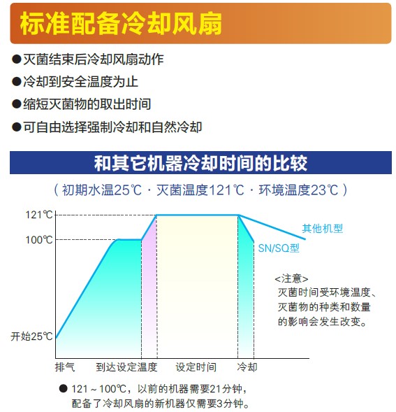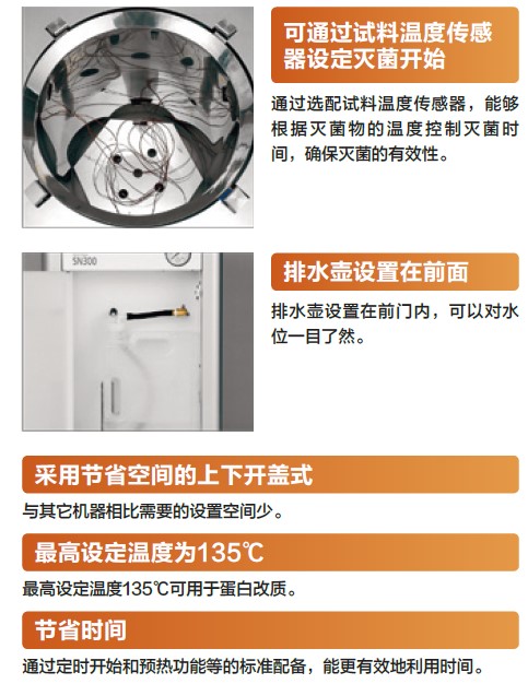 高溫度達135℃,也可用于蛋白改質(zhì)。 通常的滅菌,以及培養(yǎng)基、液體的滅菌和培養(yǎng)基的溶解都能通過簡單的設(shè)定進行操作。 除了各滅菌程序的設(shè)定,可以設(shè)定任意工程,進行重復(fù)運行。 標準裝備有縮短冷卻時間的冷卻風葉。 操作面板及顯示器都裝在上蓋的前面,方便觀看和操作。 設(shè)有多重壓力蓋開啟保護鎖,各種安全保護措施充分。 SQ為低床型,高度非常適合滅菌物的拿取。