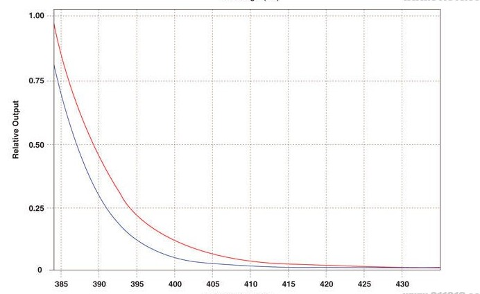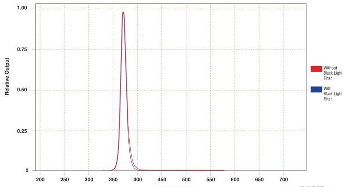 名義紫外照射 OPTI-LUX™ 365典型波長(zhǎng)輸出圖,紅色為不配黑色濾色片的波長(zhǎng)輸出,藍(lán)色為配黑色濾色片的濾長(zhǎng)輸出,峰值都是365nm。 配及不配內(nèi)置黑色濾色片時(shí)波長(zhǎng)輸出 當(dāng) OPTI-LUX™ 365的波長(zhǎng)進(jìn)入可見(jiàn)光范圍時(shí),在400nm波長(zhǎng)時(shí),配有黑色濾色片可顯著降低強(qiáng)度達(dá)50%。