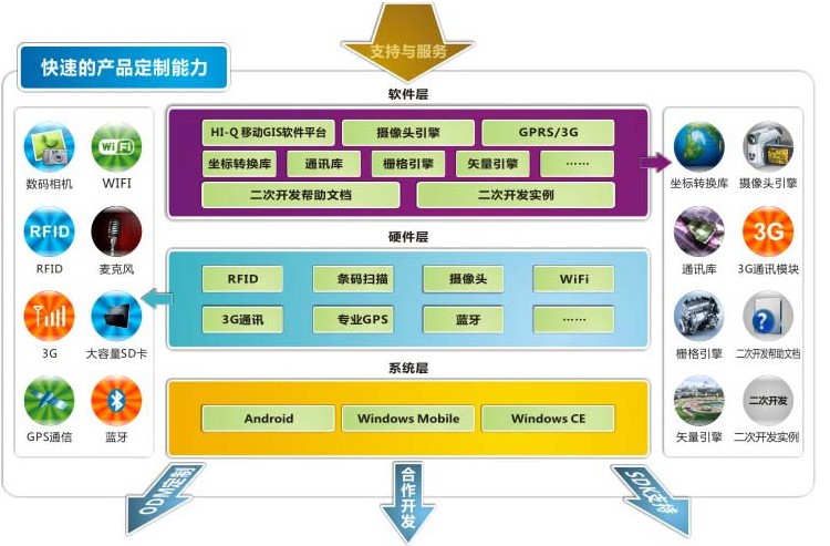 軟件定制:HI-Q移動GIS軟件平臺,攝像頭引擎,坐標(biāo)轉(zhuǎn)換庫,通訊庫,柵格引擎,矢量引擎,二次開發(fā)幫助文檔,二次開發(fā)實例等;