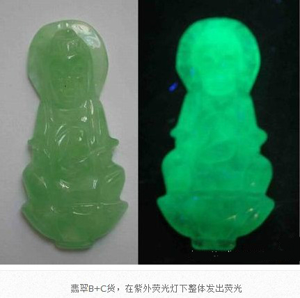 翡翠B貨、B+C貨都經(jīng)歷了強(qiáng)酸浸蝕、有機(jī)膠充填或者充蠟的處理過程。在紫外熒光燈照射下,有機(jī)膠和蠟都會(huì)發(fā)出明顯的紫外熒光,也就是整個(gè)翡翠出現(xiàn)均勻的紫外熒光,視為處理翡翠。天然翡翠因不含有機(jī)膠和蠟,在紫外熒光燈下不會(huì)發(fā)出紫外熒光。