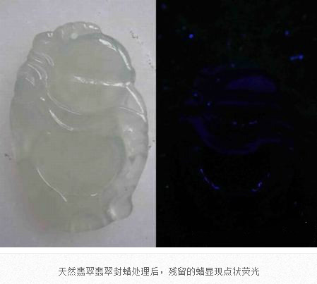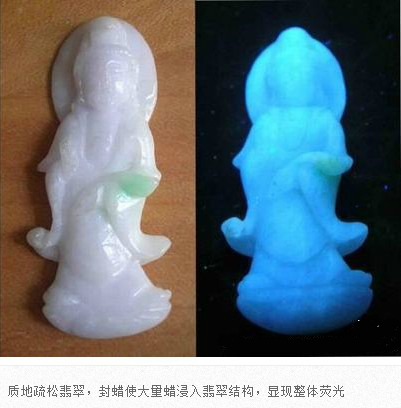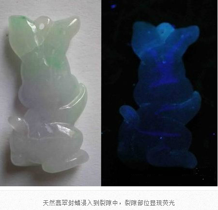 翡翠成品在雕刻成為毛坯后,在拋光前,都會(huì)進(jìn)行封蠟處理,封蠟后可使蠟在拋光后進(jìn)入翡翠表面存在的微細(xì)凹坑或裂隙中,填補(bǔ)其不平,使翡翠顯得更加圓潤,增加其光亮程度亮,還可防止油漬的進(jìn)入。當(dāng)然,封蠟的最主要的目的就是為了掩蓋裂紋。由于有蠟存在于翡翠中,在紫外熒光燈下會(huì)產(chǎn)生明顯紫外熒光。